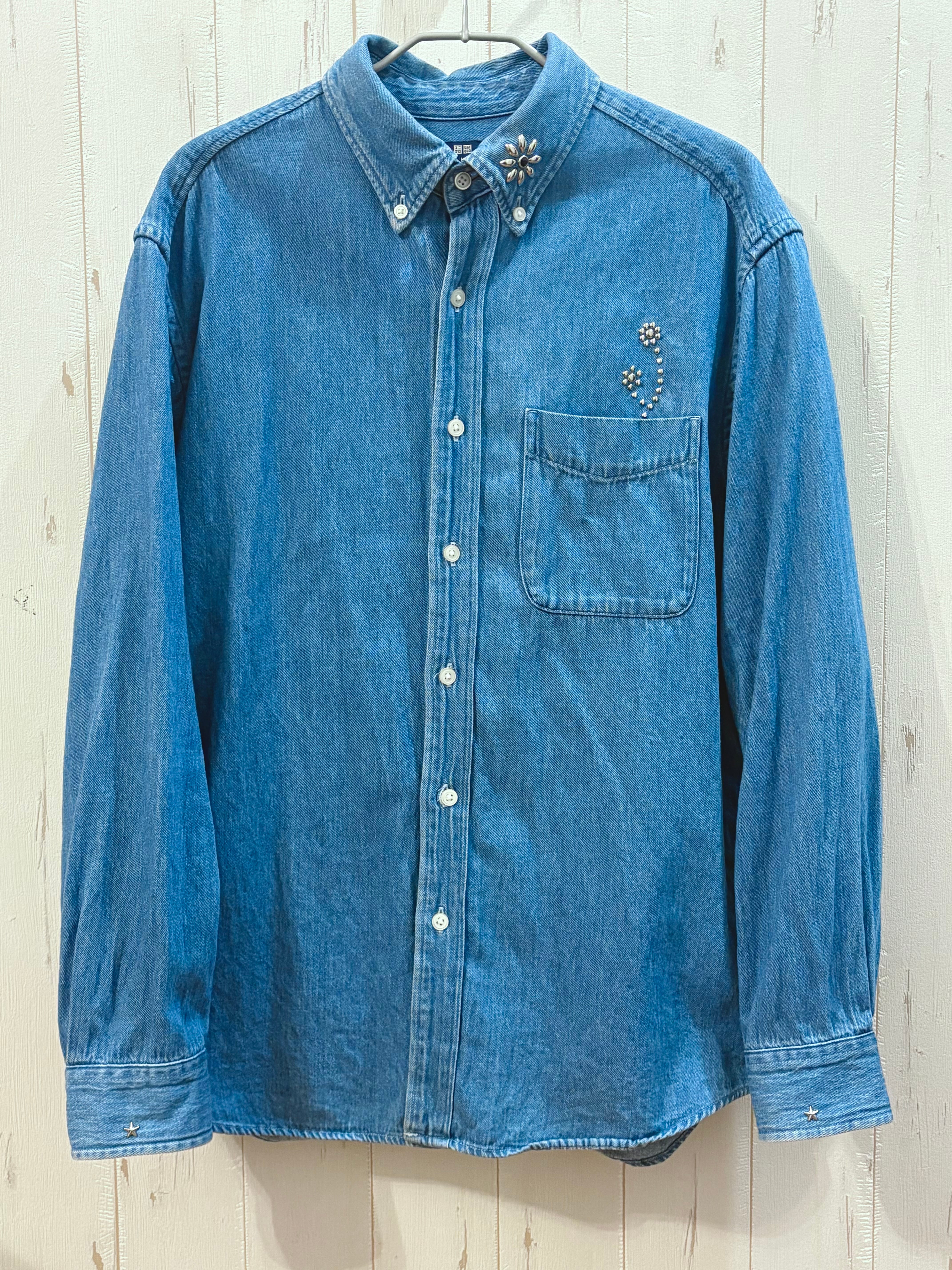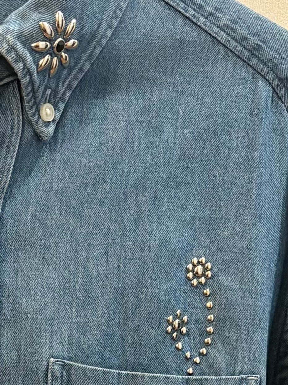 鮮やかなスタッズが全体を引き立て、カジュアルながらも個性的な印象を与えています。さらに、柔らかなデニム生地を使用しているため、着心地もとても良く、デイリーウェアとして大活躍します。